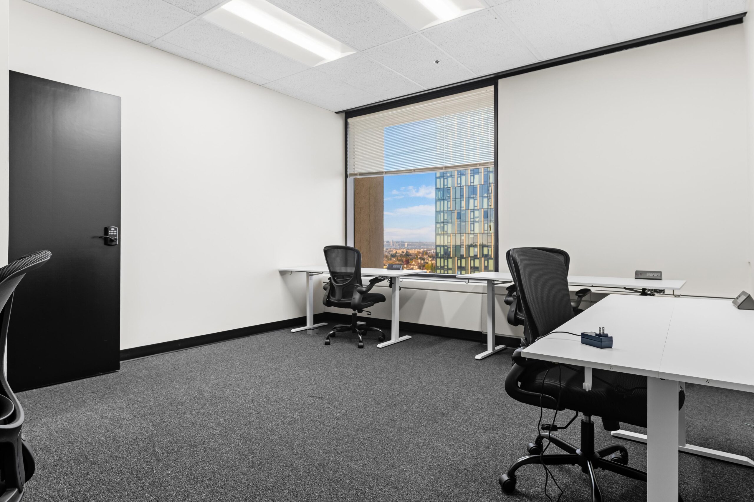 Dedicated standing desks within shared, lockable offices